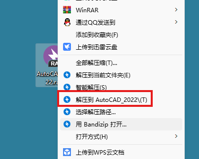 第一步:找到下载好的软件鼠标右击【AutoCAD_2022】压缩包,选择【解压到CAD2022(64bit)】。