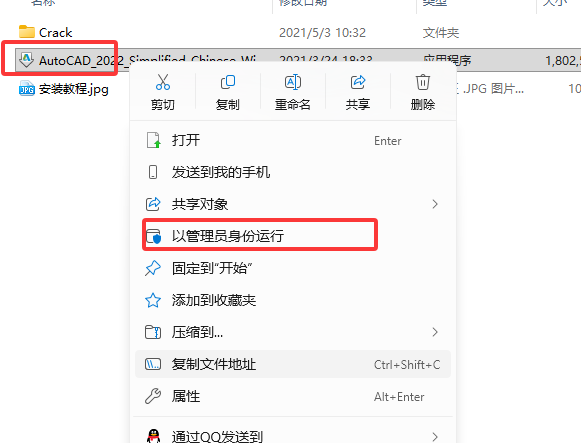 第三步:鼠标右击【AutoCAD_2022_Simplified_Chinese_Win_64bit_dlm.sfx】文件,选择【以管理员身份运行】。