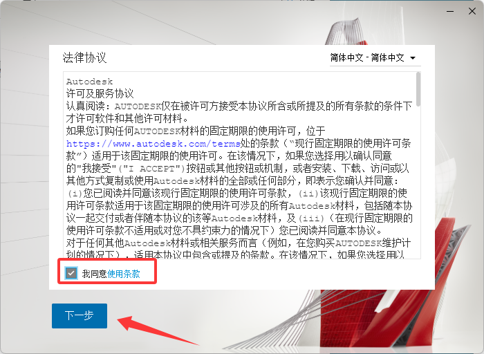 第六步:勾选【我同意使用条款】,点击【下一步】。